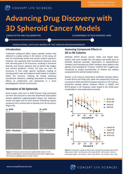 Traditional compound effect assays typically involve cells adhered to a plate surface in 2D culture. In this setup, all cells are functionally similar and receive uniform exposure. However, this approach lacks translational relevance since cells naturally grow in 3D structures, resulting in functional diversity and uneven exposure due to factors like oxygen and nutrient gradients. Certain cell lines can form 3Dstructures in vitro under specific conditions, leading to varying growth rates and exposure levels based on location within the structure. Utilizing 3D models enhances translational relevance, enabling assessment of compound effects on proliferation and cytotoxicity in a more physiologically relevant environment
